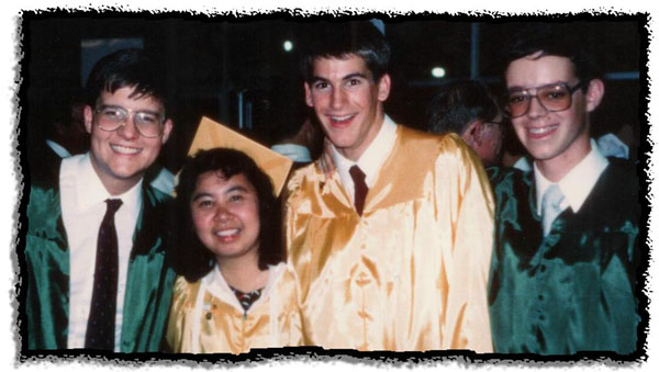 | At West High School, he excelled at academics and was socially active in clubs. He was the Swim Team Captain and earned the title of Valley Champion in 1986. His senior year, he was chosen Homecoming King; it was the only time someone other than a football player had been chosen. He graduated in 1987 as the valedictorian of his class with many honors and scholarships, including National Merit Scholar and U.C. Regents Scholar. On his senior photo, he wrote, “There is no purpose in life but to be happy and do what you want to do without harming others. Everybody has free will. Life is too important to be taken seriously.” |