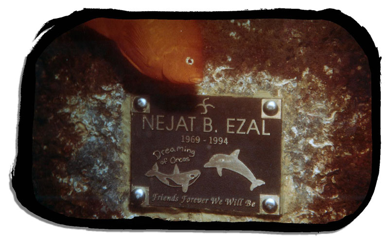 | A plaque honoring Nejat, and including one of his thoughts, was placed in the waters off Santa Catalina Island just outside of the Casino Point Underwater Park. Divers visit it annually to clean it. |